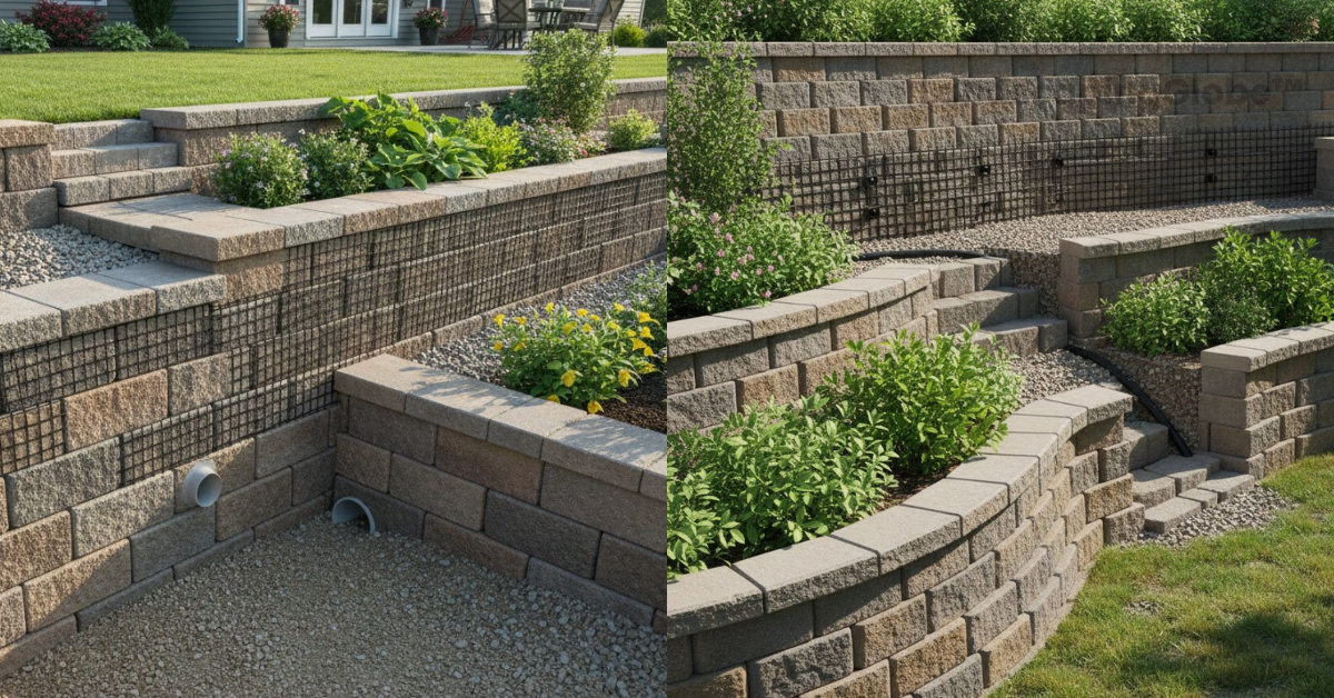 | Examples | Walls supporting driveways, terraced gardens, and soil stabilization near foundations | Low garden borders, patio seating walls, and property line markers | Engineered walls faced with attractive stone or brick for terraced gardens |